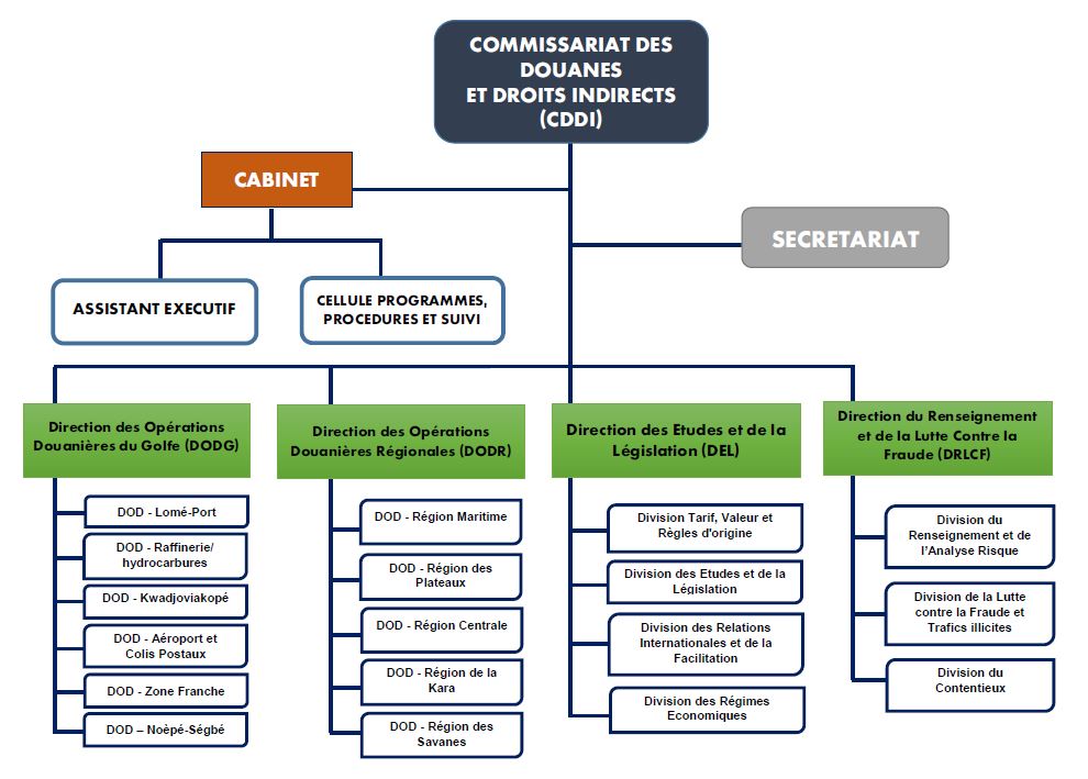 - Direction des Opérations Douanières du Golfe (DODG) - Direction des Opérations Douanières Régionales (DODR) - Direction du Renseignement et de Lutte contre la Fraude (DRLCF) - Direction des Etudes et Législation (DEL)
