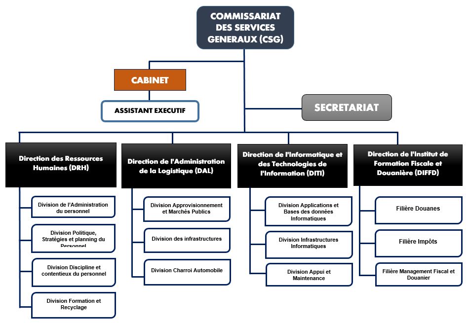 Missions : Sous la supervision du Commissaire Général, et comme membre du Comité de Direction de l’OTR, le Commissaire des Services Généraux est chargé de diriger et guider le Département des Services Généraux de l’administration de l 'OTR et de fournir un soutien administratif aux Commissariats des Impôts, des Douanes et les directions d’appui; de planifier et coordonner la gestion efficace et efficiente de toutes les ressources du Commissariat.